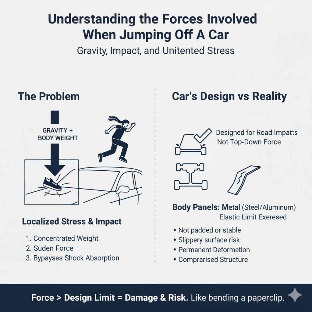As you can see, the dynamic, concentrated impact of a jump far exceeds the forces the car’s surface panels are designed to handle. While suspension is built for impacts, those impacts come from the wheels, not from a person landing on the bodywork.