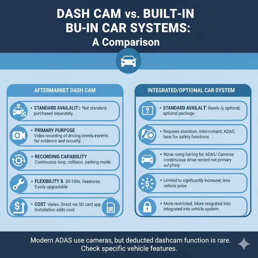 While cars don’t typically come with dash cams, some advanced driver-assistance systems (ADAS) might offer similar functionalities or integrate with optional dash cam systems. Here’s a quick comparison: