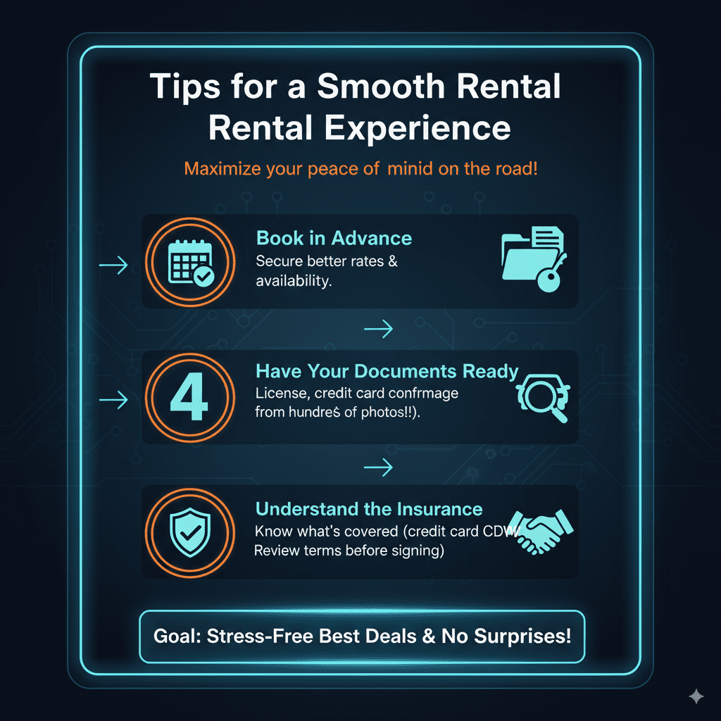 - Confirmation: You’ll review the full rental terms, including mileage limits, fuel policies, and insurance options. Make sure to read these carefully!