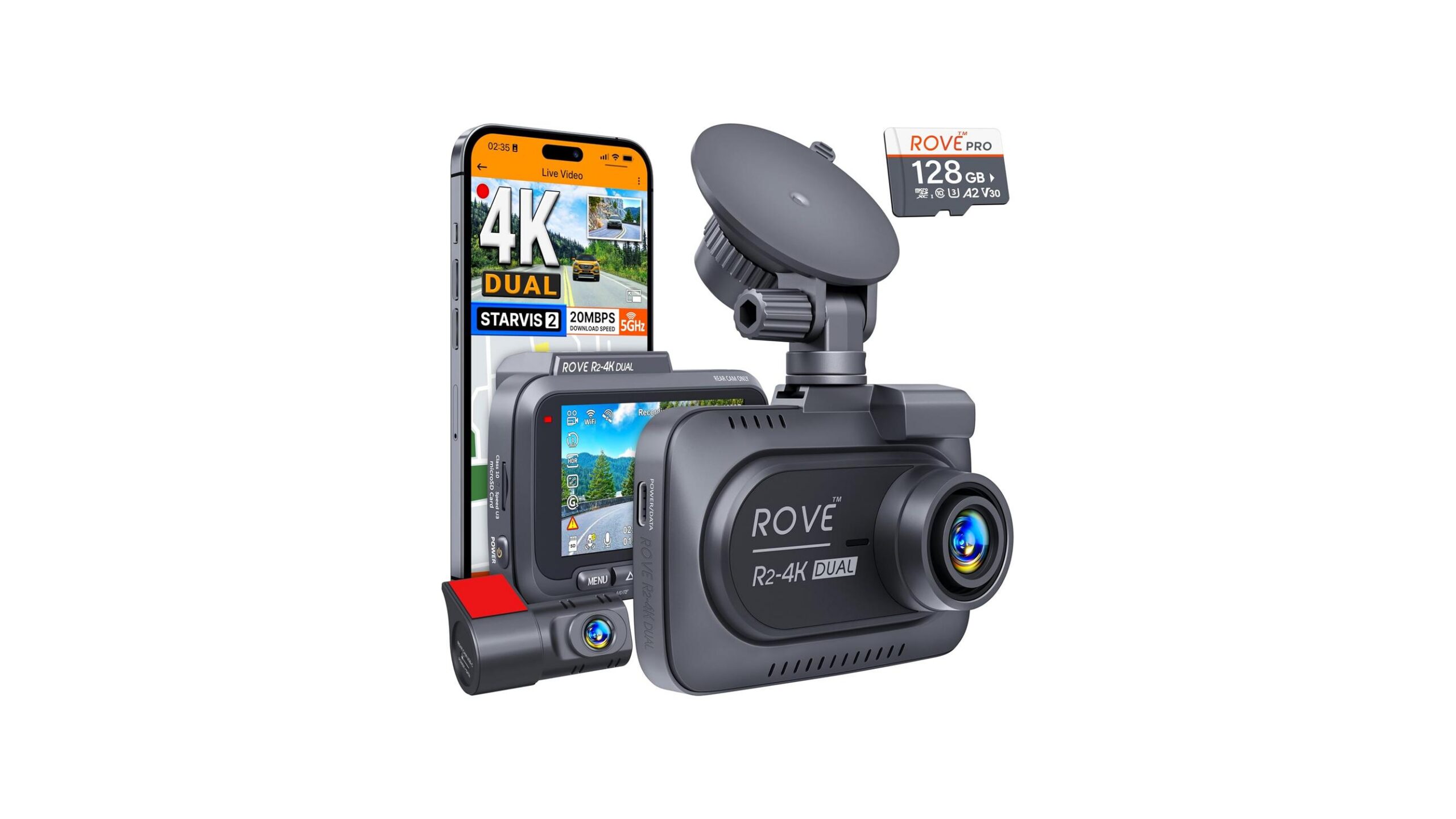 ROVE R2-4K DUAL Dash Cam Front and Rear, STARVIS 2 Sensor, FREE 128GB Card Included, 5G WiFi – up to 20MB/s Fastest Download Speed with App, 4K 2160P/FHD Dash Camera for Cars, 3″ IPS, 24H Parking Mode