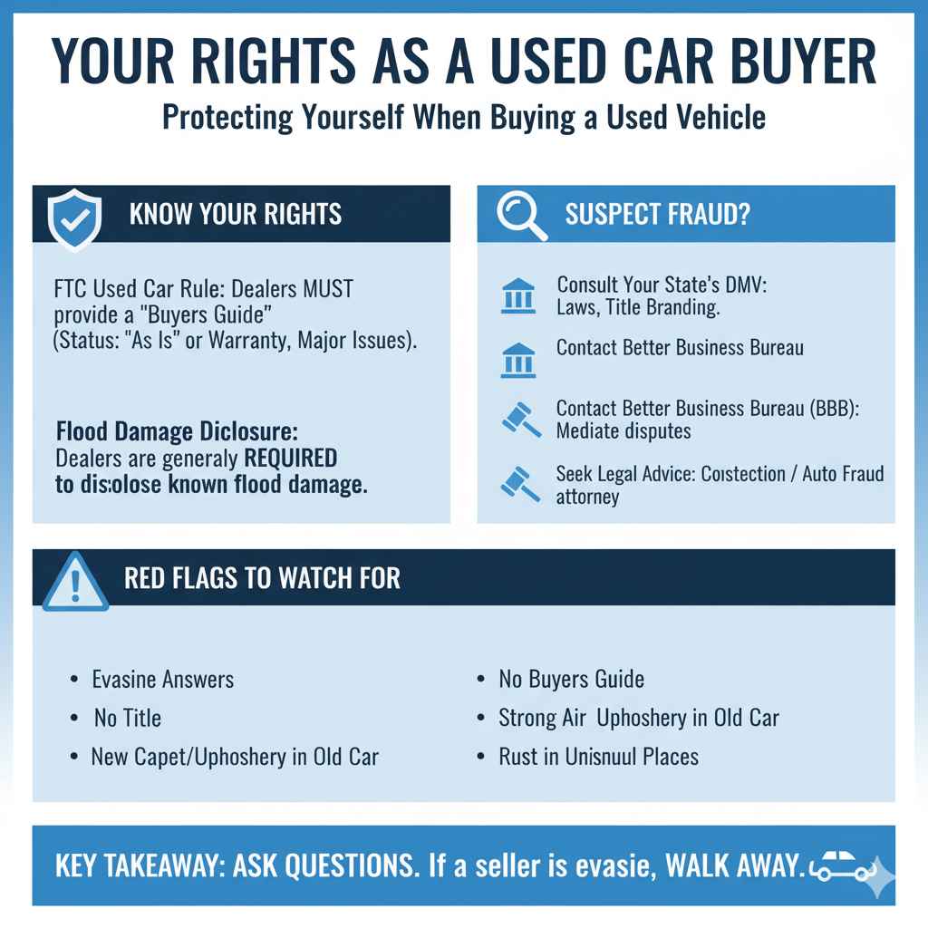 Laws vary by state, but in general, you have rights when purchasing a used vehicle. The FTC’s Used Car Rule requires dealers to provide a Buyers Guide, which indicates whether the car is sold “as is” or with a warranty and highlights major issues. Importantly, if a dealer knows a car has flood damage, they are generally required to disclose it. If you suspect a dealership has misled you about flood damage: